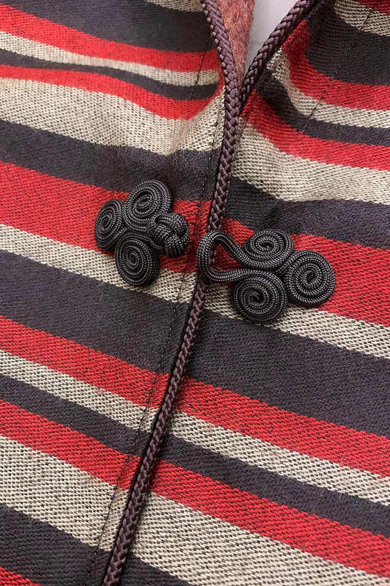 The collar was a shawl collar, the sleeves had turn-up cuffs, and the buttons were toggle buttons or a wrap-around belt.
