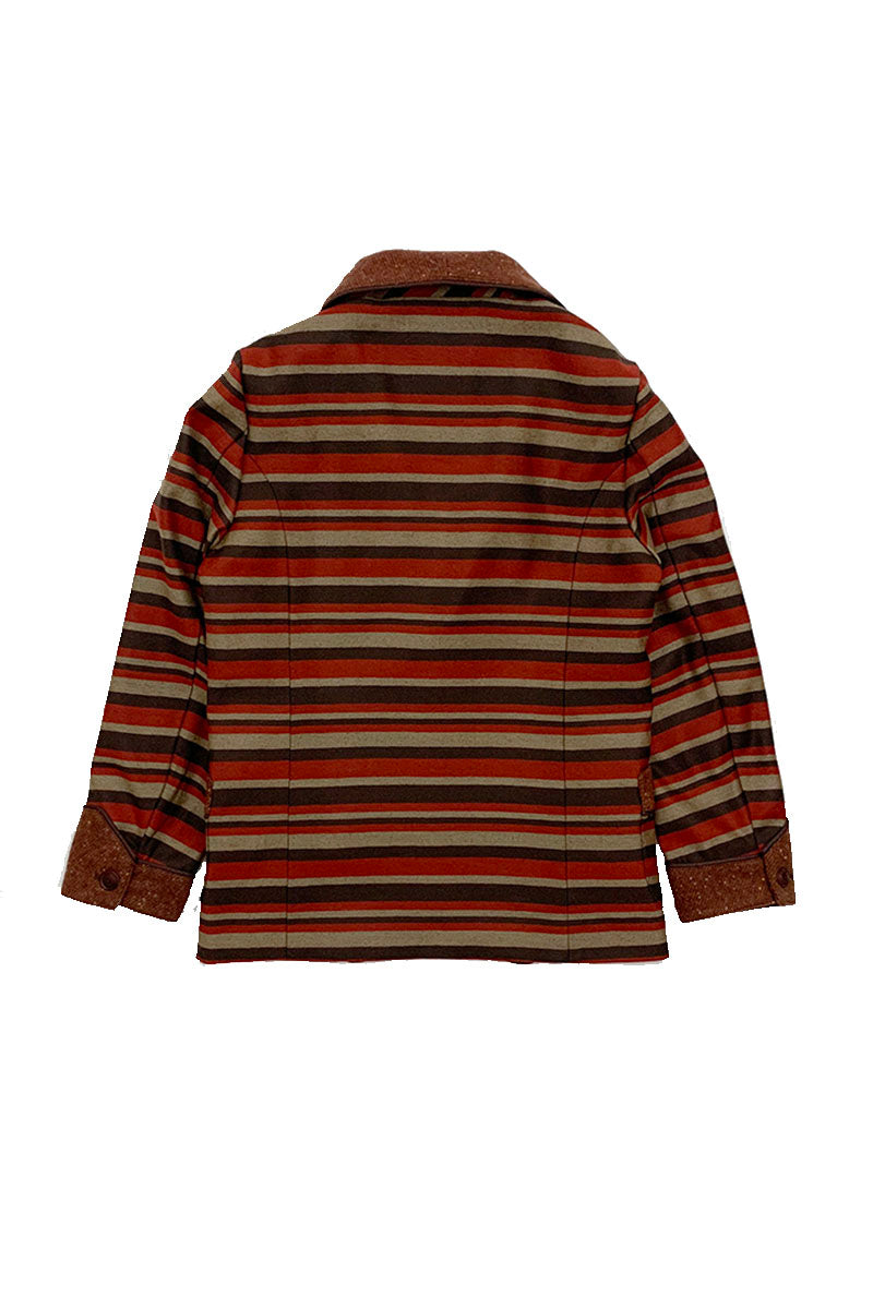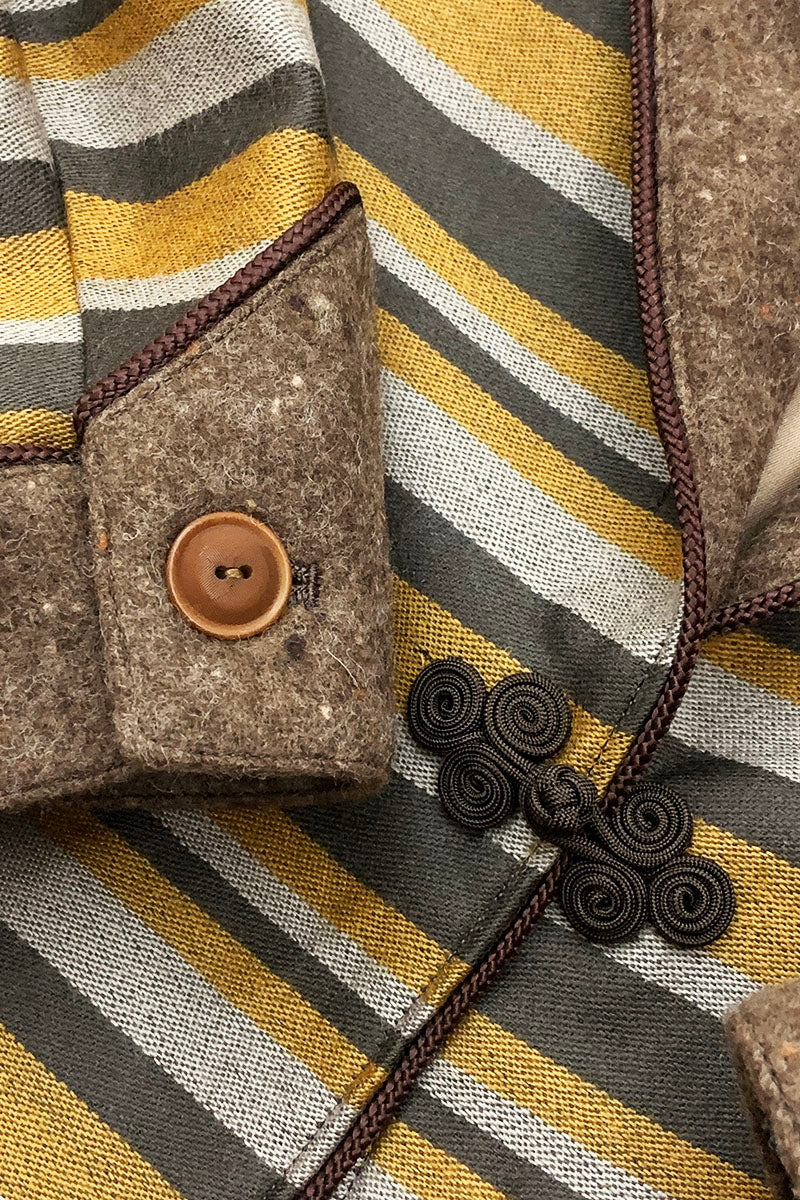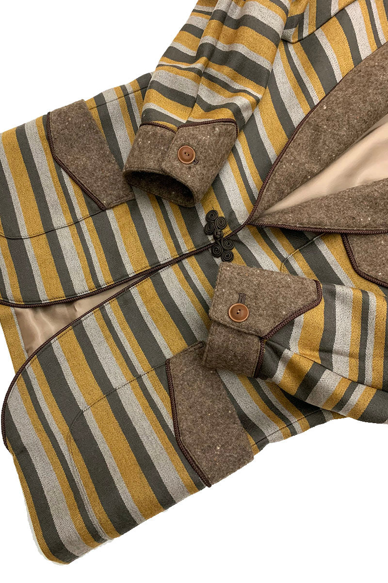 Avant-garde striped wool Venetian is used for the body, while vibrant plain wool flannel is used for the shawl collar and turned-up cuffs.