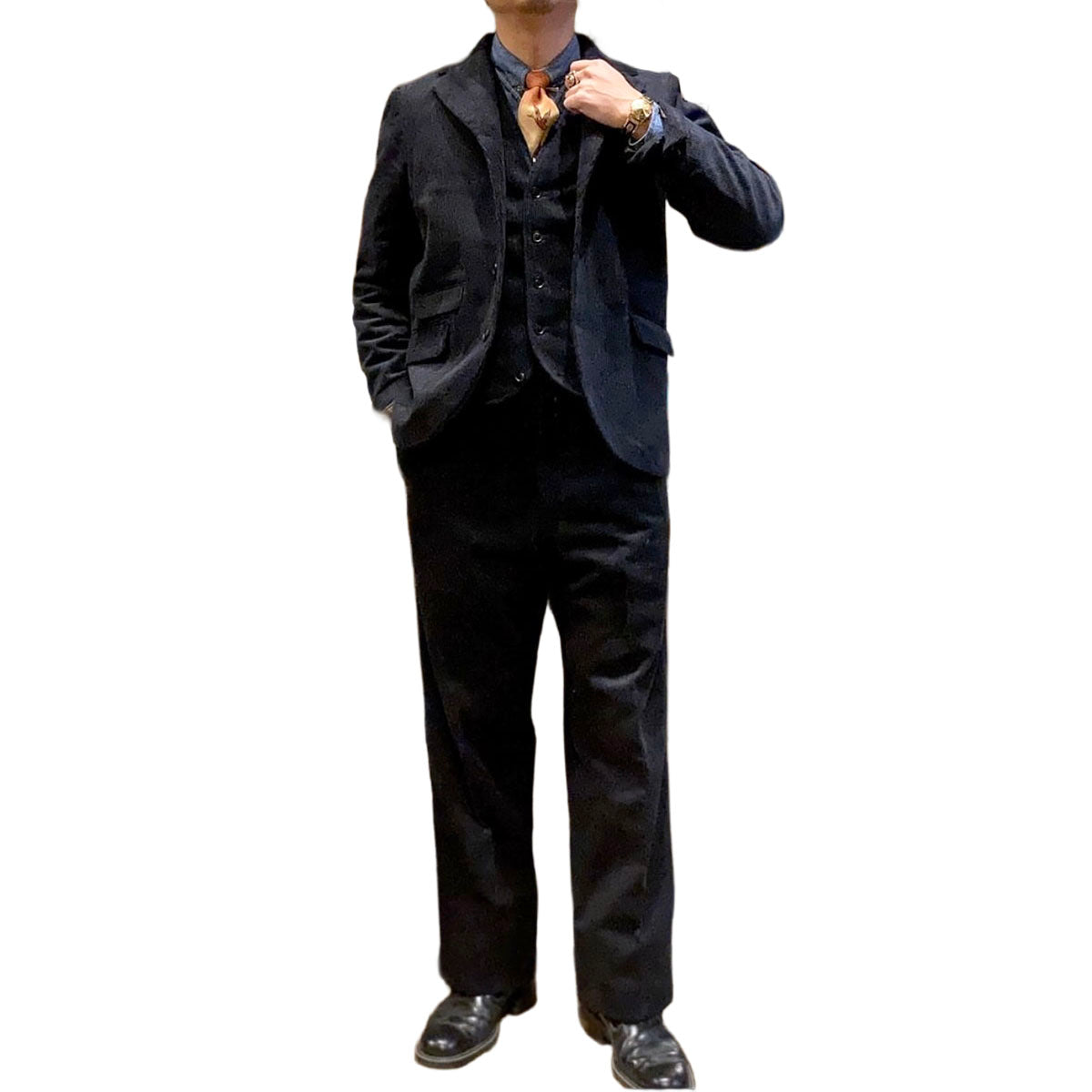 Of course, it is a classic to wear it as a three-piece suit with trousers and a vest in the same material. If you combine it with wool trousers on the bottom, it will be a casual winter outfit.