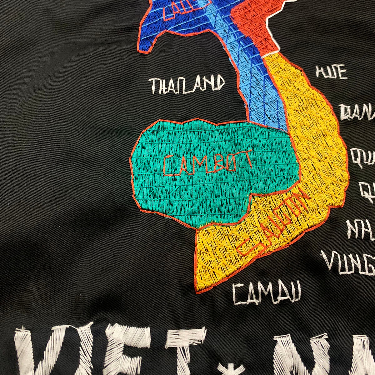 This refers to the jackets that American soldiers brought back as souvenirs from Vietnam during the Vietnam War, which lasted from around 1964 to 1975. Many of them were made from recycled parachute and sleeping bag fabric used in the war. Most of the materials are cheap, such as nylon or cotton x polyester. On the chest, there are hand-embroidered Chinese motifs such as tigers, dragons, or the Chinese character for "happiness." On the back, there are hand-embroidered maps and place names of Vietnam, or military unit marks. The majority were.