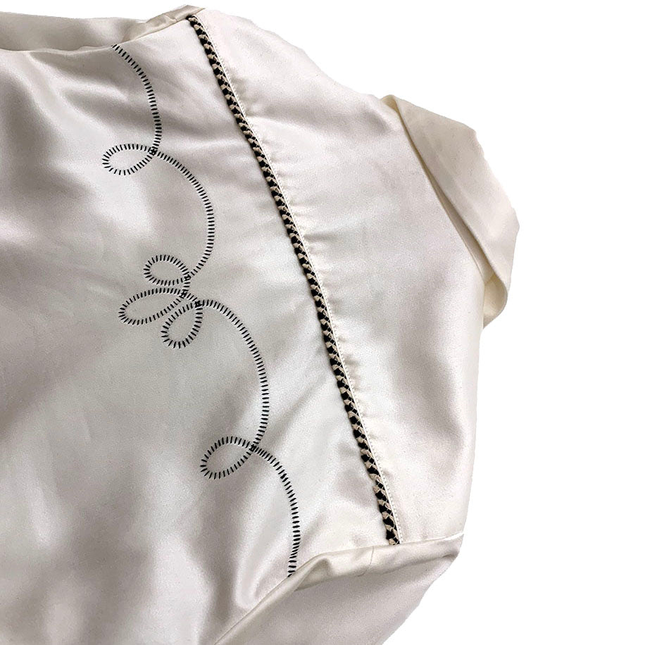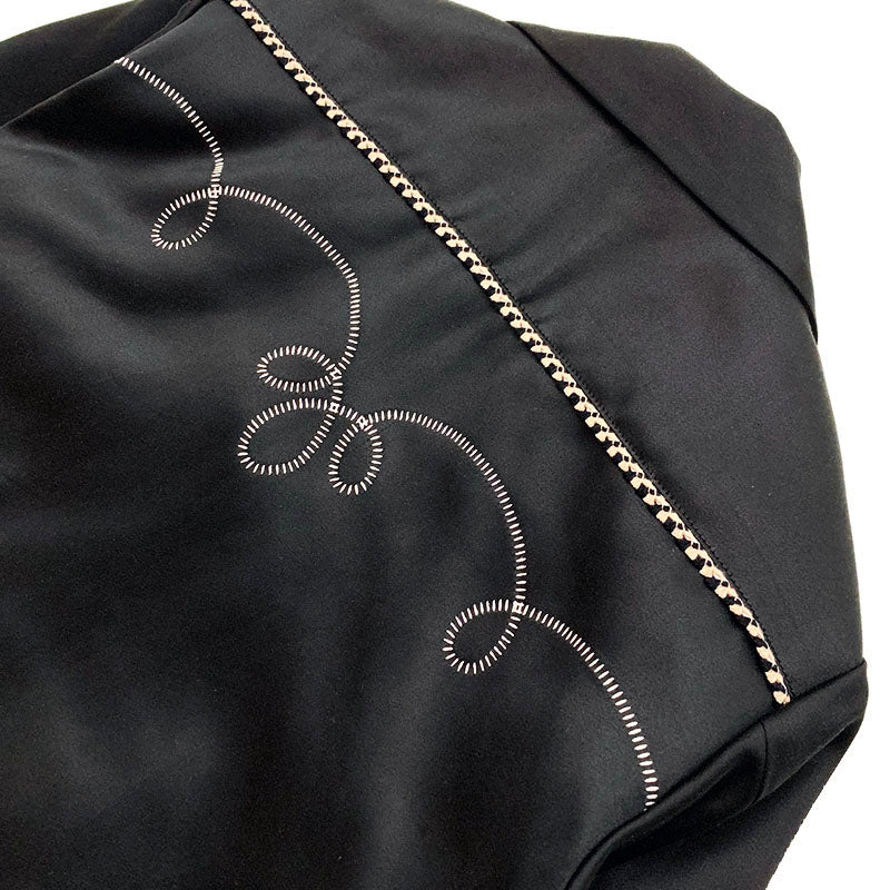 The special piping that was produced at the time is also reproduced. This accessory took a lot of time and effort to make, as it is made by folding and sewing ultra-fine rayon grosgrain tape in two colors, black and white, alternately.
