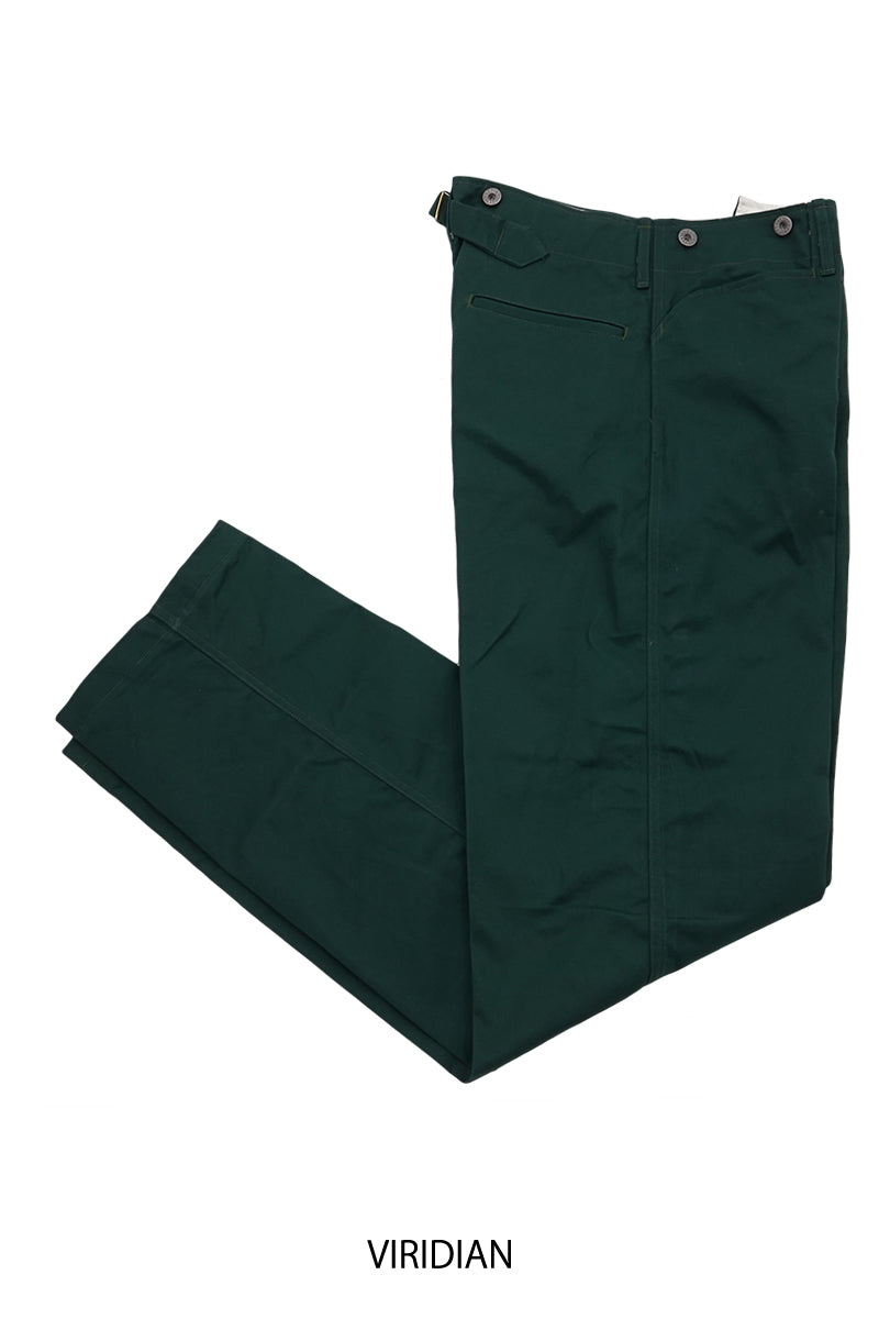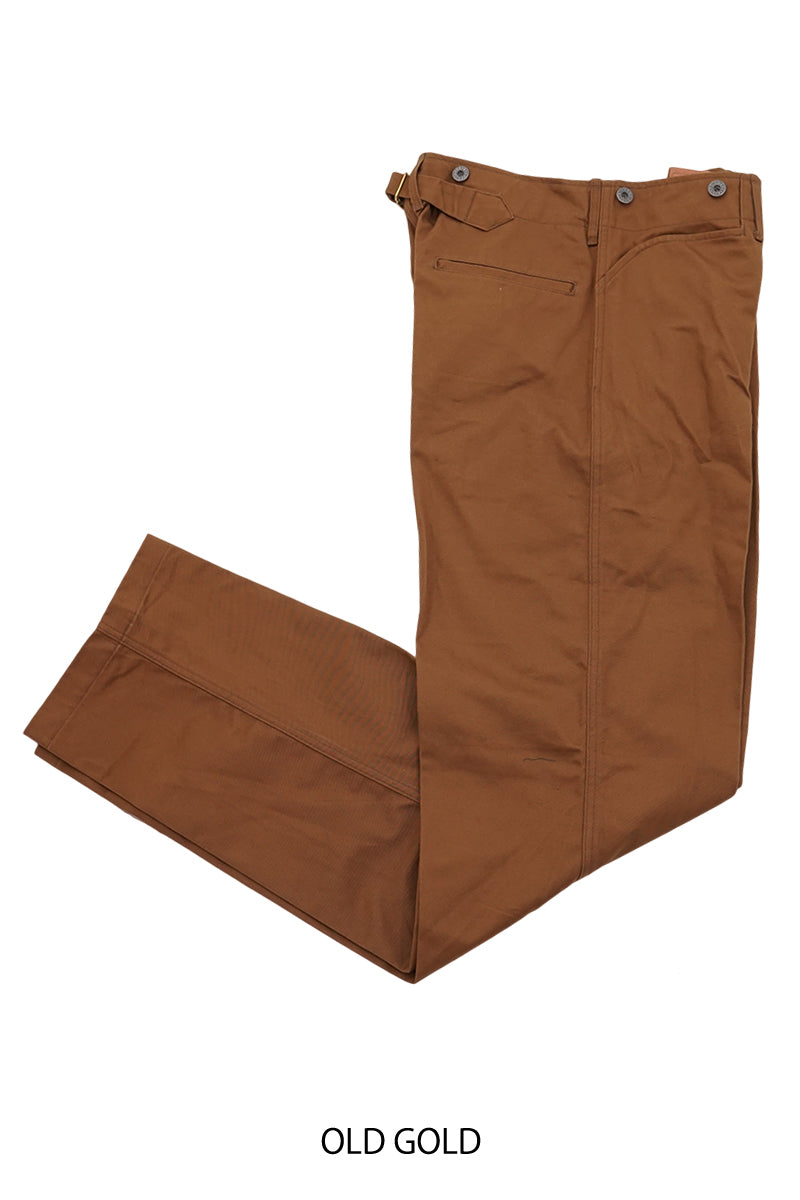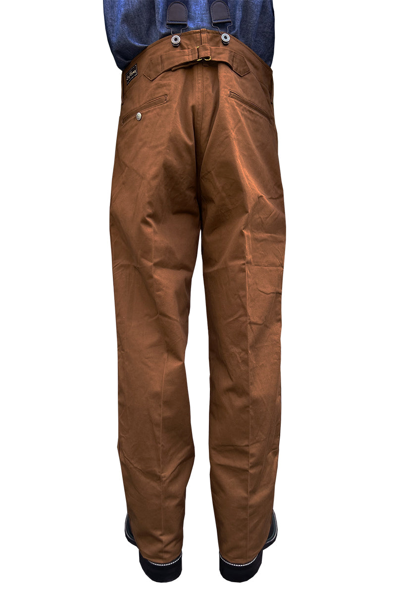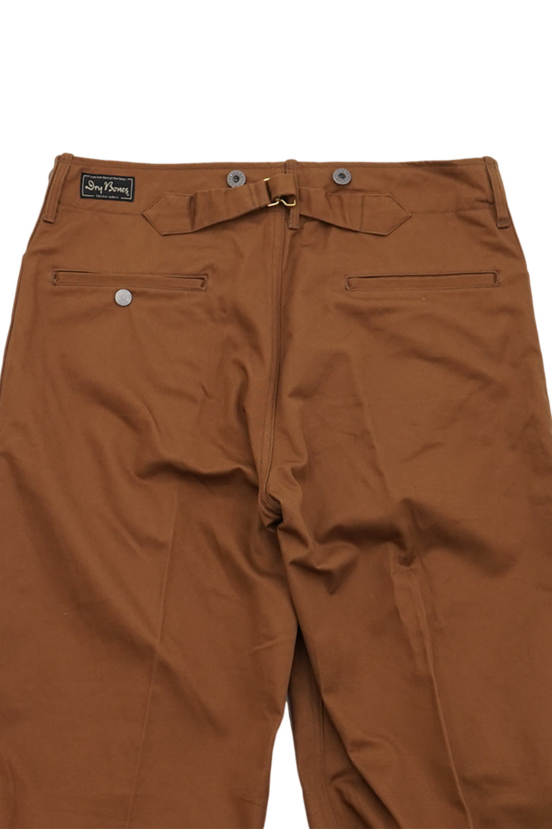 バックセンターにはバックストラップが付き、サスペンダーボタンがつきます。このバックストラップでウエストサイズを調整していた頃のディテールを再現。但し、現代のファッション事情にも合わせるべく、ベルトループもつけておきました。