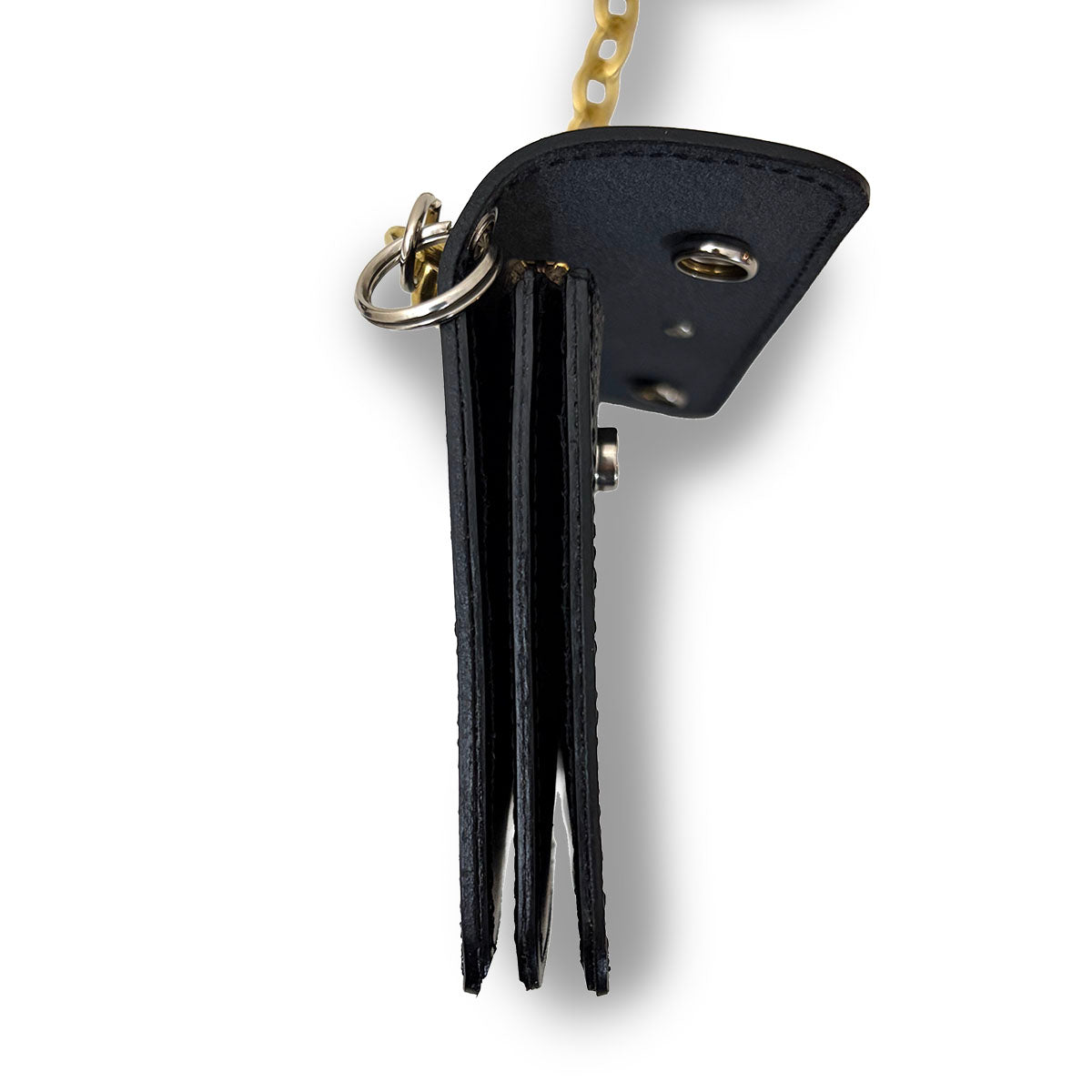 同素材のタブがチェーンの先につき、ベルトなどに固定できる様になっています。