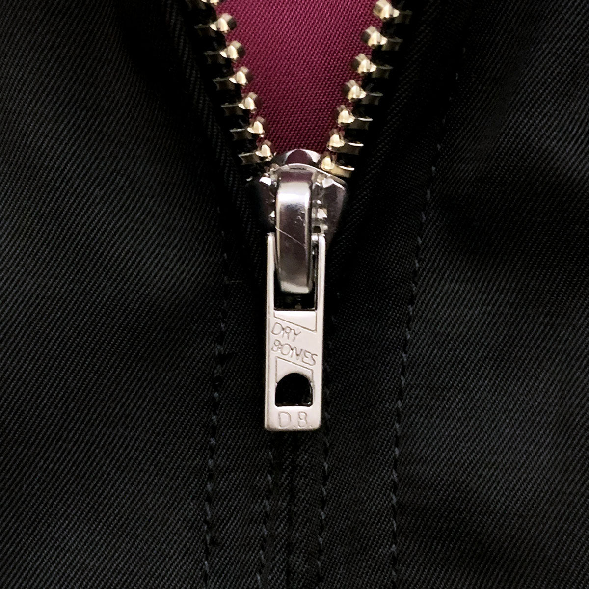 まずは表地の素材。チープなジャケットから脱却すべく、敢えてレーヨン/コットンツイルを使用。鮮やかな刺繍が映えるようにジェットブラックで染めています。