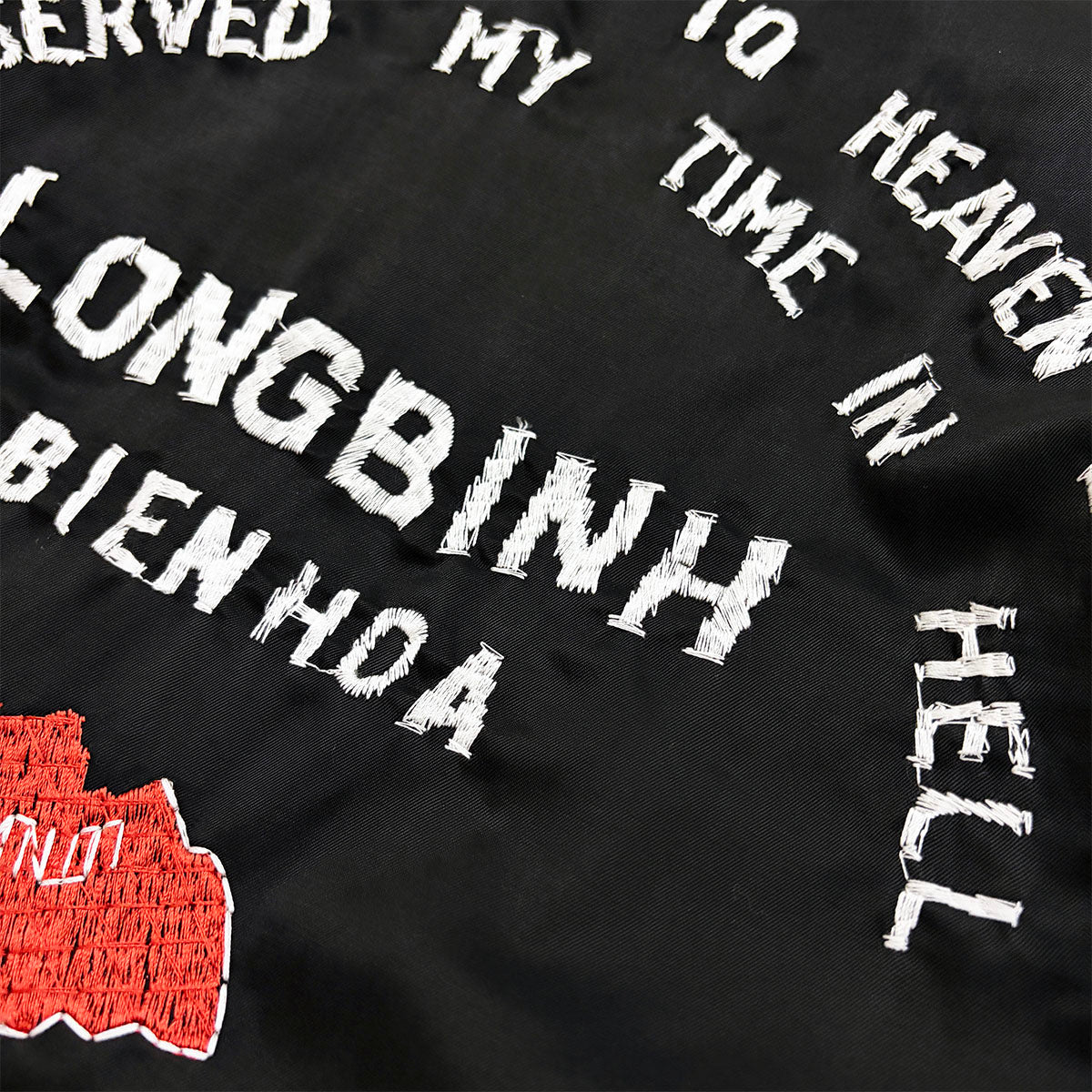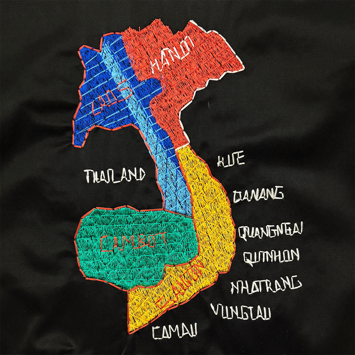 1964年頃から1975年まで続いたベトナム戦争時に、アメリカ兵がベトナムから土産として持ち帰ってきたジャケットの事を指します。戦争で使われたパラシュートや寝袋生地を再利用して作られたものが多く、素材はナイロンや綿×ポリエステルなどのチープなモノが大半です。胸には虎や龍、もしくは福という漢字などチャイナ系モティーフの手刺繍。背中にはベトナムの地図や地名、もしくは部隊マークの手刺繍などが大半でした。