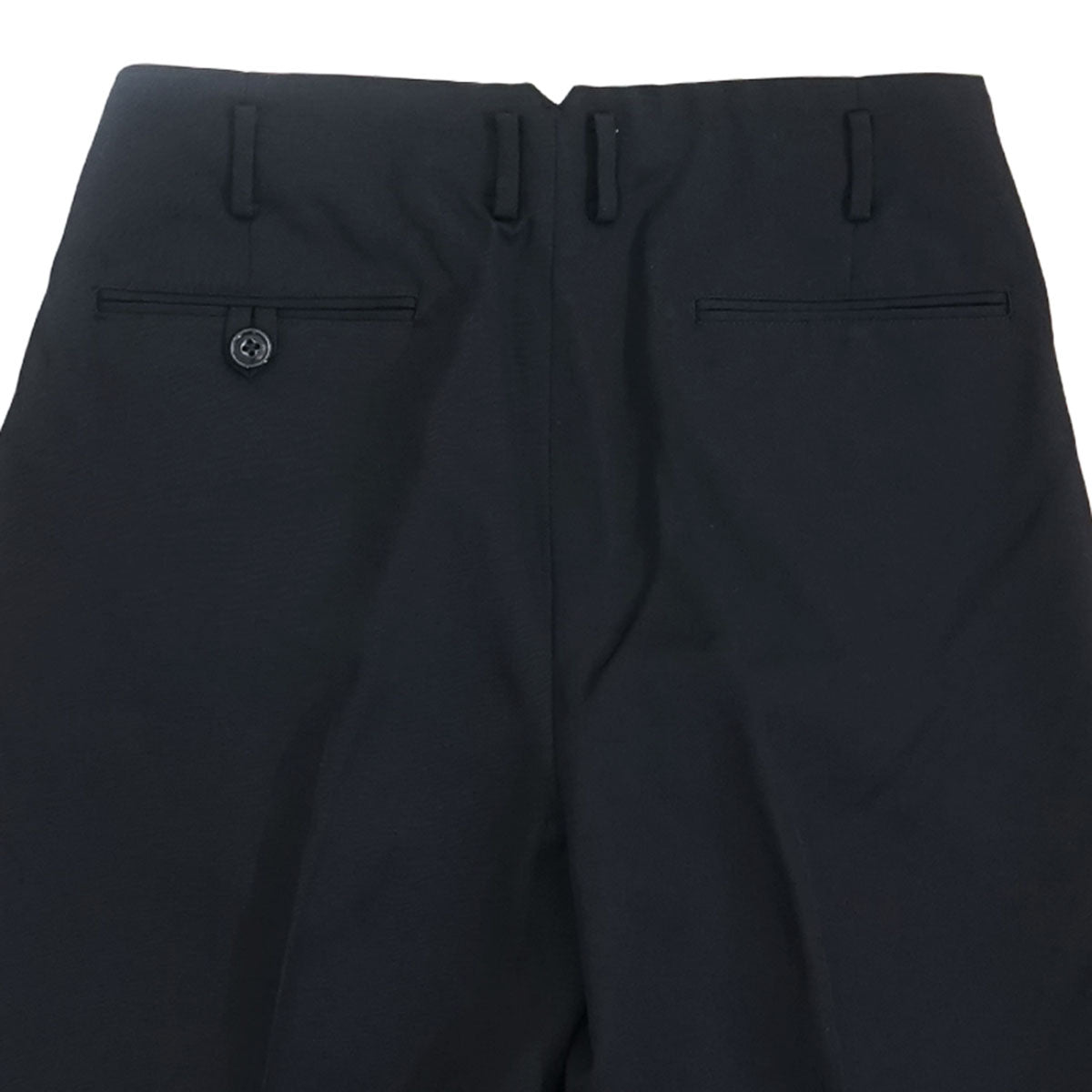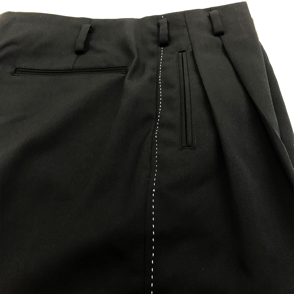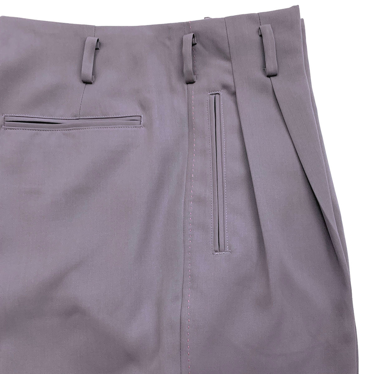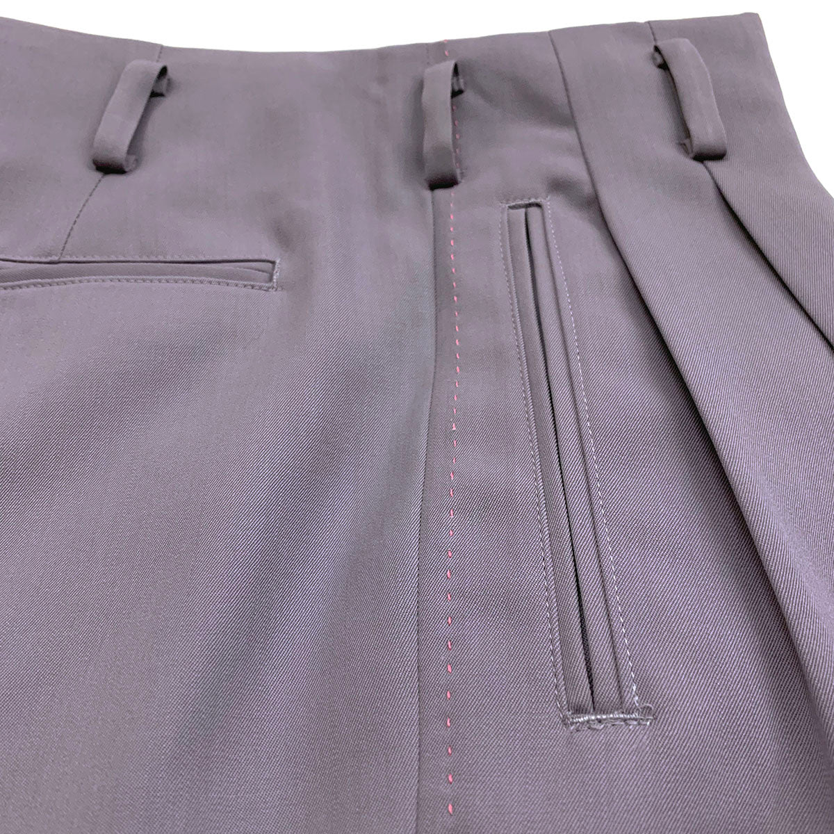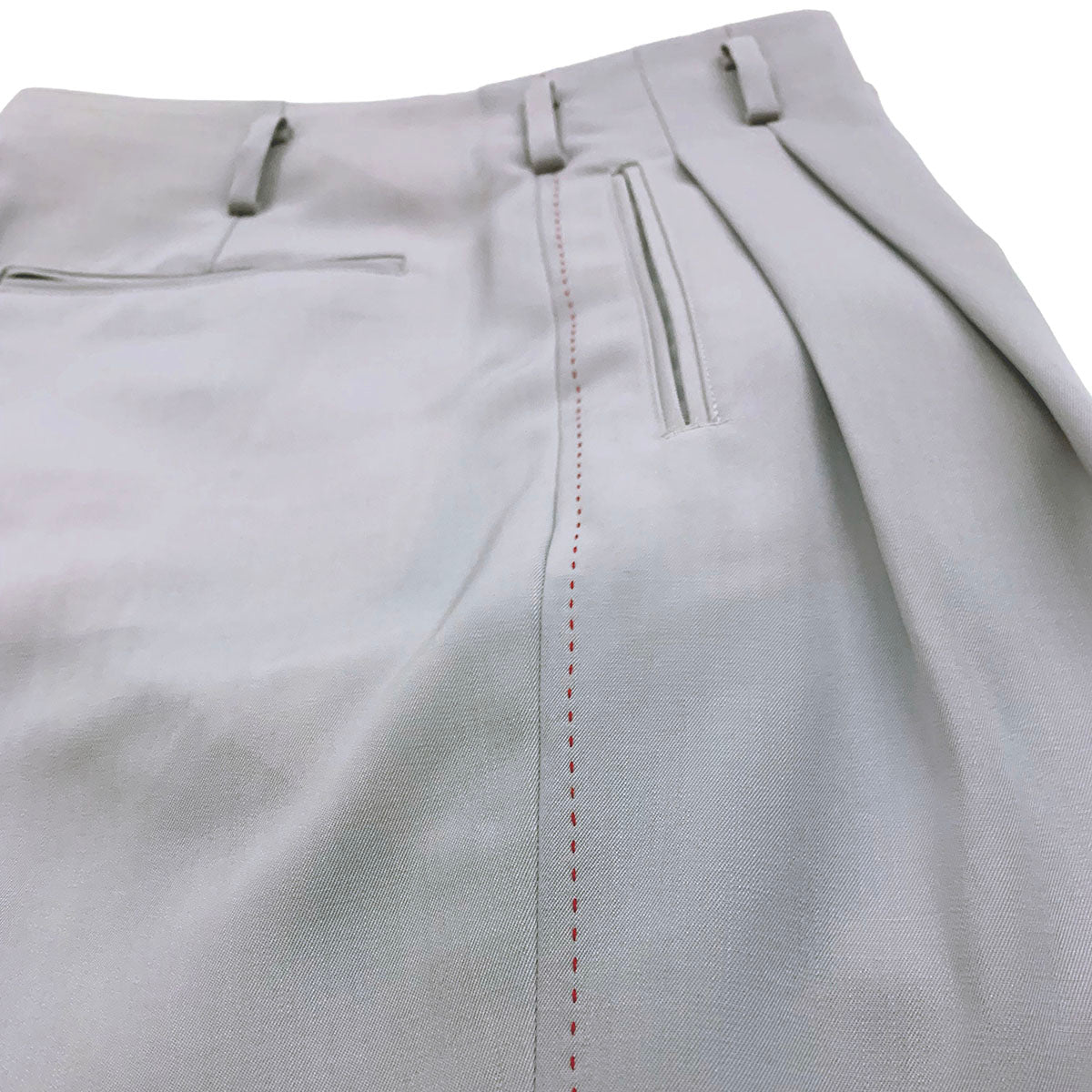 トラウザーズとは本来、身頃とベルト部分は切り離されており、地の目を変えて縫製する事で生地の伸縮を抑える役目を果たしています。が、この当時のハリウッドベルトは身頃がそのままベルト部分まで持ち上がってきており、更に2本のタックが入って実に綺麗なドレープ感を出しています。