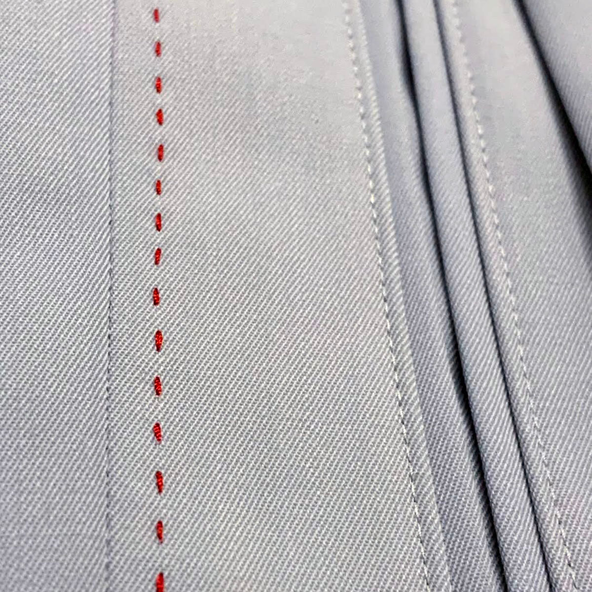 また、1940年代後期から1950年代前期にかけてはタックと脇線のちょうど中間に両玉縁のポケットをつけることが流行しました。これは縫製上、非常に手間が掛かるポケットの作り方ですが…これもしっかりと再現しました。