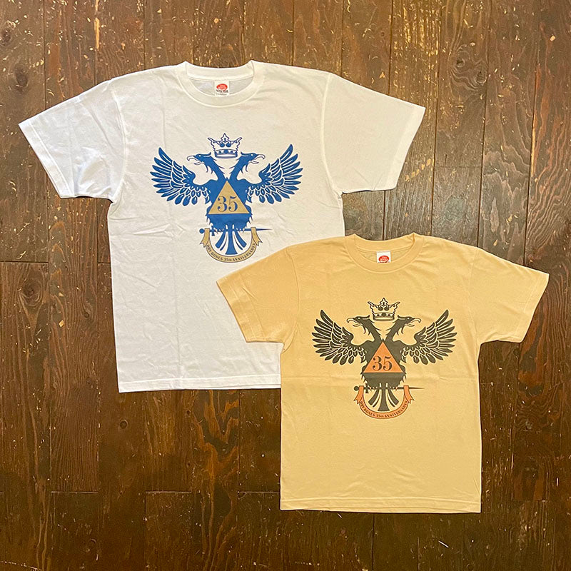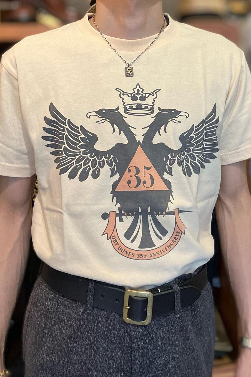 有名なダブルヘッド・イーグル(双頭の鷲)モティーフを用いた、ドライボーンズ35周年記念のプリントTシャツです。