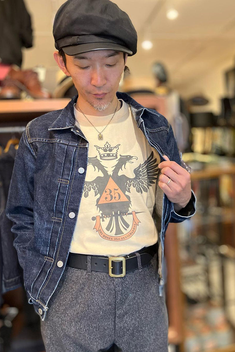 そんなダブルヘッド・イーグルを背景にあしらい、35周年を中央のピラミッドに配置。東洋的な思考や趣味で、西洋的な製法や素材を扱うドライボーンズを象徴してみました。